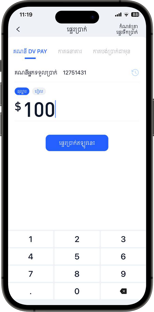 DVPay គឺជាក្រុមហ៊ុនសេវាទូទាត់ប្រាក់ដែលមានមូលដ្ឋាននៅក្នុងប្រទេសកម្ពុជា ដែលផ្តល់សេវាកម្មដូចជា ការផ្ទេរប្រាក់ ការដកប្រាក់ ការដកប្រាក់តាមអេឡិចត្រូនិក និងការទូទាត់វិក្កយបត្រដោយភ្នាក់ងារទូទាំងប្រទេស និងកម្មវិធីអ្នកប្រើប្រាស់ទូរស័ព្ទ